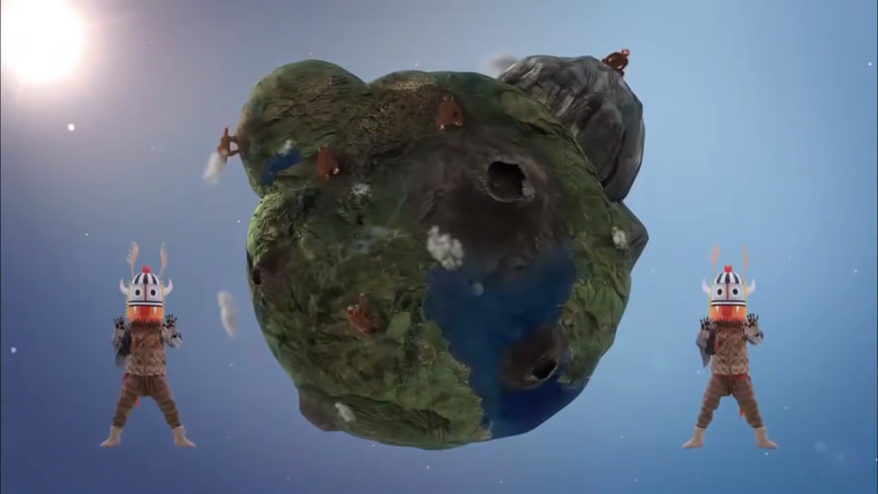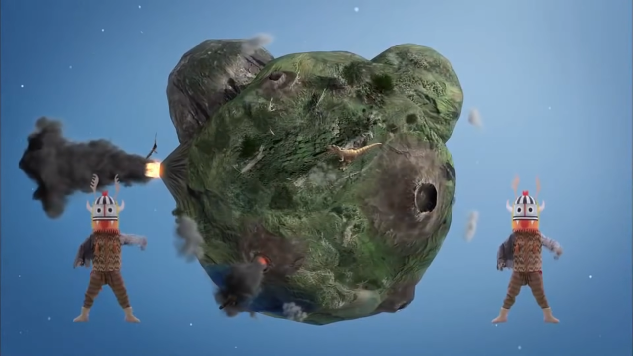 隕石が衝突しあって惑星が形成され、恐竜やマンモス、類人猿の時代を経て現在の地球になっていく様子を表現しています。